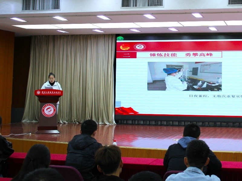 工商管理学院李昱姝同学展示了她的团队项目“‘职’为有你——专注蓝领高质量就业的先行者”,该同学紧密围绕创业项目特点讲述了创业活动的背景、意义、实施过程、取得成果等,并向师生分享了参加创新创业活动以及在赛场逐梦的体会和感悟。