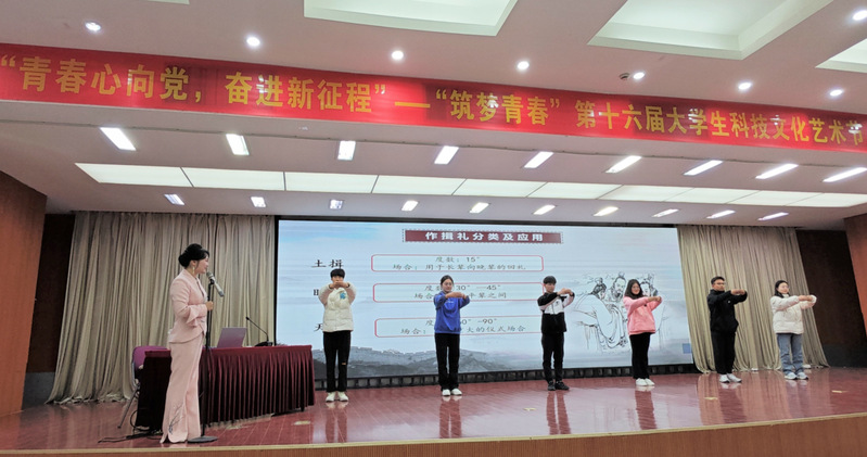 为深入学习贯彻习近平文化思想,落实五育并举,进一步浓郁学校美育氛围,传承中华优秀传统文化,让学生充分感受中华礼仪之美,11月15日下午,由我校团委主办、化学工程学院团总支承办的“博雅通识”大讲堂——“融美于礼,文化润心”专题讲座在图书馆报告厅举行,各学院团总支书记及300余名学生通过讲座一同感受了中华礼仪的魅力。
